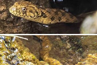 La mejor manera que existe para diferenciar una víbora (escurçó en catalán) de una serpiente de agua es mirando sus ojos. La serpiente de agua tiene las pupilas redondas mientras que las víboras las tienen verticales; como los gatos.
