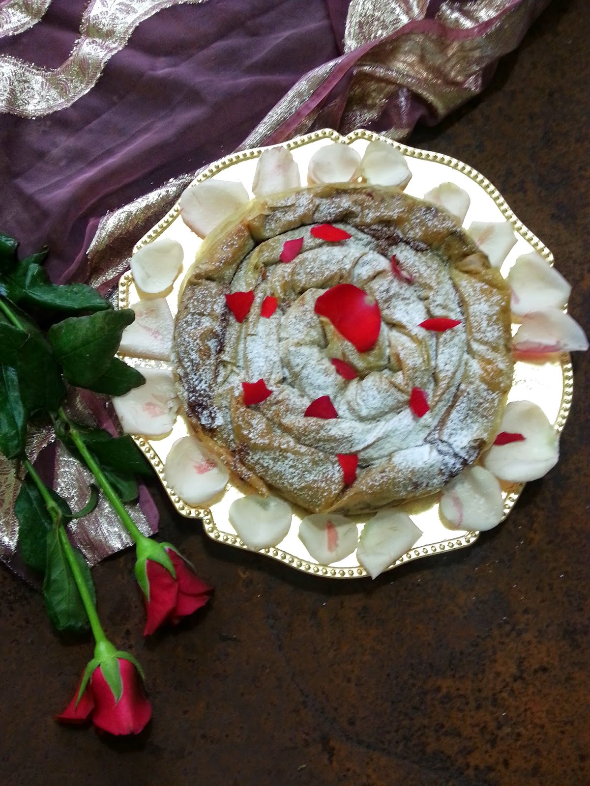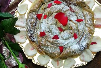Sacamos del horno y espolvoreamos con azúcar glass y petalos de rosas se ve muy marroqui, al cortar escuchen el sonido crujiente.