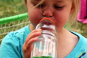 Mezcle el jabón en un plato con un poco de agua. Yo usé una proporción de 2 a 1 (2 de jabón y 1 de agua). A continuación, cortar la parte inferior de la botella. Pon la botella sobre la esponja o estropajo y trace su contorno sobre el estropajo, dejando un sobrante o margen extra para poder pegarlo alrededor de la botella con la cinta adhesiva. Recorta el círculo que hemos dibujado en la esponja y lo pegamos a la parte inferior de la botella con la cinta adhesiva. Nuestro “invento” ya está listo. Ahora, solo nos toca sumergir la parte inferior de la botella con el estropajo en el jabón y soplar por la boca de la botella. Las burbujas son gruesas y se pegan entre si haciendo una ristra con la forma de una larga serpiente.