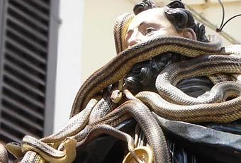 Hablamos del Festival de las serpientes de Cocullo, la Festa dei Serpari, en la que la estatua del santo patrón (Domenico di Sora) es transportada en procesión, cubierta de multitud de serpientes (sobre todo culebras de cuatro rayas, esculápicas, de collar y verdiamarillas).