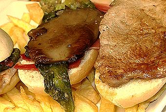 Freímos unos pimientos verdes, unos filetitos de lomo de cerdo, unas setas y al pan todo con una lonchita de jamón…