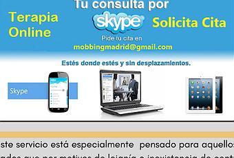 Este servicio está especialmente pensado para aquellos afectados que por motivos de lejanía o inexistencia de centro de atención adecuada, no pueden desplazarse con facilidad para recibir terapias presenciales. Este es el caso de poblaciones alejadas de grandes ciudades o capitales de provincia.Este es un servicio que viene a ser un complemento más y que en muchos casos puede mejorar el resultado final. Somos conscientes de que algunos profesionales no diagnostican ni tratan el acoso de una manera adecuada y que el acoso laboral es un problema que NO puede superarse sin apoyo familiar y social, y sin la ayuda de un profesional cualificado.Un tratamiento adecuado para las personas que han sufrido mobbing debe abordarse desde diferentes ámbitos: jurídico, medico y psicológico, con el objetivo principal de recuperar la autoestima de la víctima y evitar la consolidación de las posibles secuelas. Por ello es importante solicitar desde el principio asesoramiento especializado.Podrás realizar tu consulta para:· Terapia psicológica· Terapia Psiquiátrica· Consulta medica· Recibir tratamiento de las secuelas derivadas del mobbing, ya que en muchas ocasiones se necesita tomar medicacion· Valorar la existencia de un daño psíquicoEsta modalidad de consulta permite al afectado ganar tiempo, reduce gastos, elimina distancias y desplazamientos y realiza la sesión desde el lugar de su máxima comodidad.
