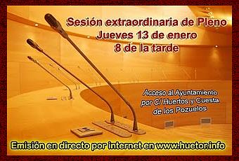 Este jueves día 13 de enero se celebrará una sesión extraordinaria del Pleno municipal a las ocho de la tarde en el que, entre otros puntos, se someterá a votación el borrador del Presupuesto para el presente ejercicio de 2011, así como el proyecto para la construcción de un nuevo recinto ferial.Como siempre, el acceso al salón de plenos se podrá realizar por la calle Huertos o por la Cuesta de los Pozuelos, y también podrá verse en directo por internet a través de este enlace.
