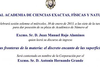 El próximo 30 de enero de 2013 se celebrará la sesión solemne de toma de posesión de Juan Manuel Rojo, nuevo Académico de la Real Academia de Ciencias Exactas, Físicas y Naturañes (RACEFyN). El discurso de contestación correrá a cargo del Académico Antonio Hernando.