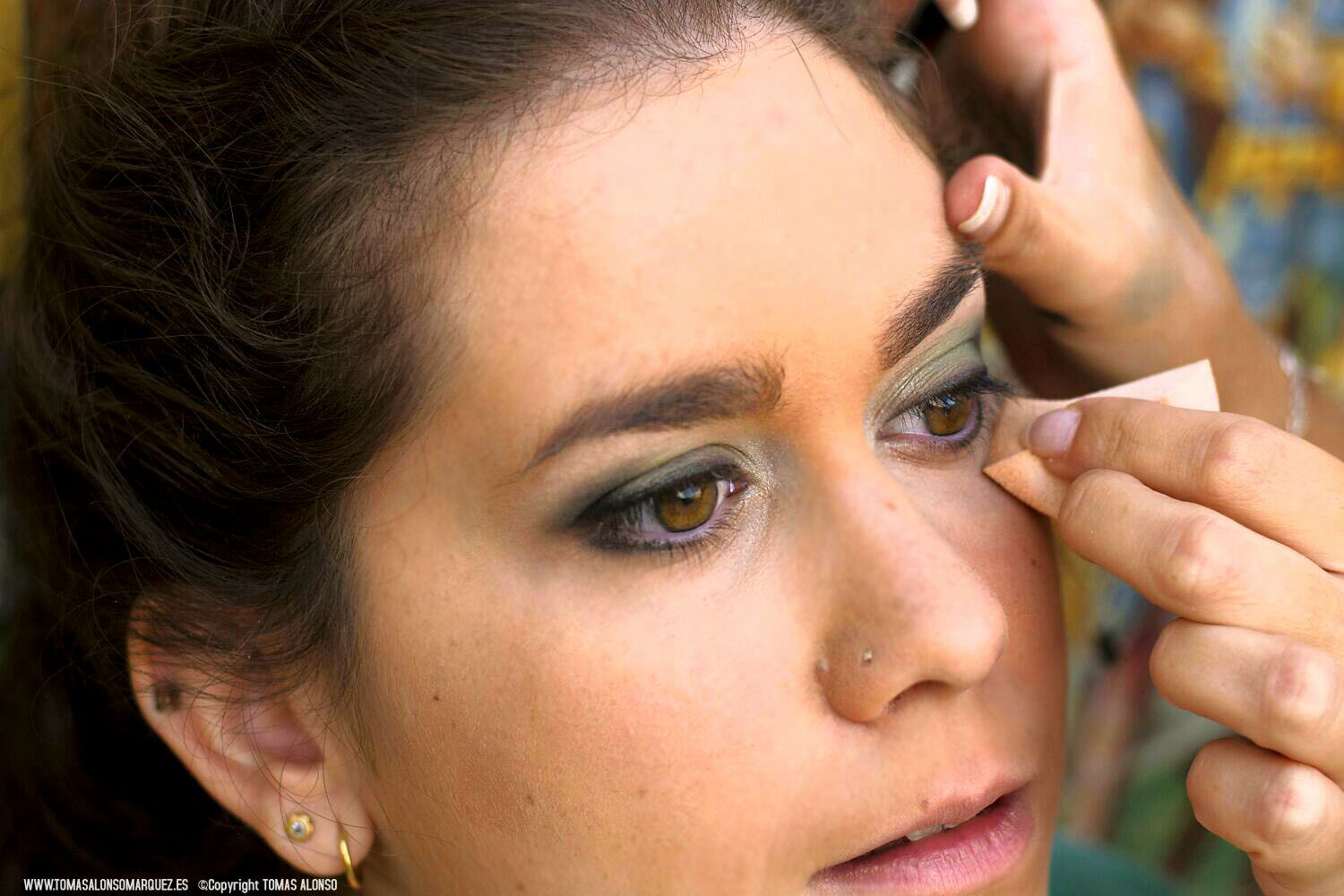 Puesto que el look de la modelo se basaba en un estilo con aires hippies de tonos verdosos, me centré en tonalidades verdosas con un toque ligeramente blanco irisado para aportarle un poco de luz a la mirada.