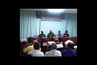 El presidente del Consejo de Defensa Provincial, Ariel Santana Santiesteban junto a Lilian González Rodríguez, vicepresidenta de esa instancia, intercambiaron con autoridades del Consejo de Defensa en Manatí, para conocer de las acciones que se implementan en el municipio ante la amenaza que representa el huracán Irma. Durante el encuentro se informó que en Manatí ya se trabaja en la protección de importantes recursos de la agricultura entre ellos cosechas de viandas y granos, molinos de viento, máquinas de riego, así como el ganado que se encuentra en áreas bajas, mientras que se alistan las condiciones en los cinco centros de evacuación para cuando se decida su empleo.Ariel Santana Santiesteban expresó que además de estas acciones, resulta sumamente importante prestar toda la atención a las medidas para la protección de la población y sus bienes, así como las comunicaciones y el abasto de agua a las comunidades, en particular aquellas más distantes.Sesión del Consejo de Defensa Municipal.