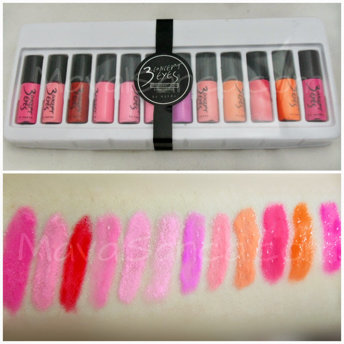 3 Concept Eyes es una marca Coreana de cosméticos de gama alta.Este set de mini glosses indica que son de esta marca. Sin embargo cuando busqué en internet descubrí que son falsos puesto que 3 Concept Eyes no tiene este set.3 Concept Eyes is a Korean brand of high-end cosmetics. This set of mini glosses indicates that they are of the same brand. But when I searched in the internet I found that are false because 3 Concept Eyes doesn't have this set.