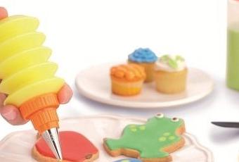 La manera de decorar las galletas que ofrece Kuhn Rikon es gracias a unos biberones de repostería que tienen pico vertedor en la punta de aluminio y un cuerpo de plástico flexible en forma de acordeón para que al ir apretando el envase el contenido de la crema cobertura vaya saliendo para crear formas y diseños con las diversas boquillas con las que cuenta.