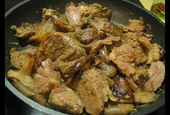 Rociamos una sartén con un poco de aceite e introducimos la cebolleta. En cuanto coja color, añadiremos las setas y el baicon. Esperamos a que todo se haya hecho bien y sólo nos queda verter el bote de crema de soja para cocina. Nosotros incorporar unos trozos de pierna de cordero deshuesada que teníamos congelados para rehogarlos con las setas y después incorporar la crema de soja. ¡Quedó muy bueno!