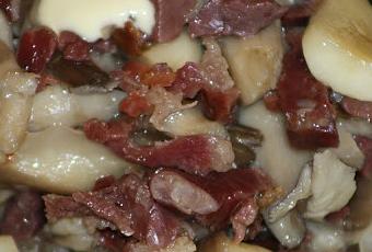 Cuando están dorados añadimos las setas cortadas a tiritas y sofreimos.