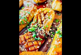 5. Emplatamos, rociamos por encima semillas de sésamo y cebollino. Servimos inmediatamente. Puedes servir con arroz blanco cocido y comer tal cual o usarlas como acompañamiento de algo más.
