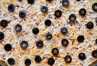 1. Alubias refritas. El secreto de mi marido es añadirle un diente de ajo crudo triturado. También le añade pimienta. 2. Pimiento verde cortado a trocitos pequeños (aproximadamente medio pimiento grande). Le da una textura crujiente. 3. Crema agria (sour cream). Utilizamos crème fraiche porque es lo más parecido (unos 300 ml en total). Otro toque especial es mezclar un poco de pimienta cayena y pimentón colorado al gusto. 4. Guacamole (hacemos una versión simple, con 2 aguacates triturados, mezclados con el zumo de media lima, sal y una pizca de nuez moscada). 5. Salsa. A pesar del nombre, y después de probar varias marcas, la que más nos gusta es la Dippas picante. Se le puede mezclar un tomate troceado para darle un toque más fresco. 6. Queso rallado. Podemos usar cheddar, o una mezcla de quesos como la de la foto (Emmental, Cheddar y Gouda curado). 7. Olivas negras. Cortadas a rodajas para decorar y darle un poco de alegría.