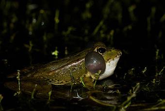 Macho de Rana verde (Pelophylax perezi) cantandoPero las aves no son las únicas que utilizan la música en sus cortejos, los anfibios, y en particular las ranas y los sapos, también la utilizan, y al igual que en las aves, las características de sus cantos varían según las condiciones ambientales pero también dependen del contexto social en el que se encuentren.