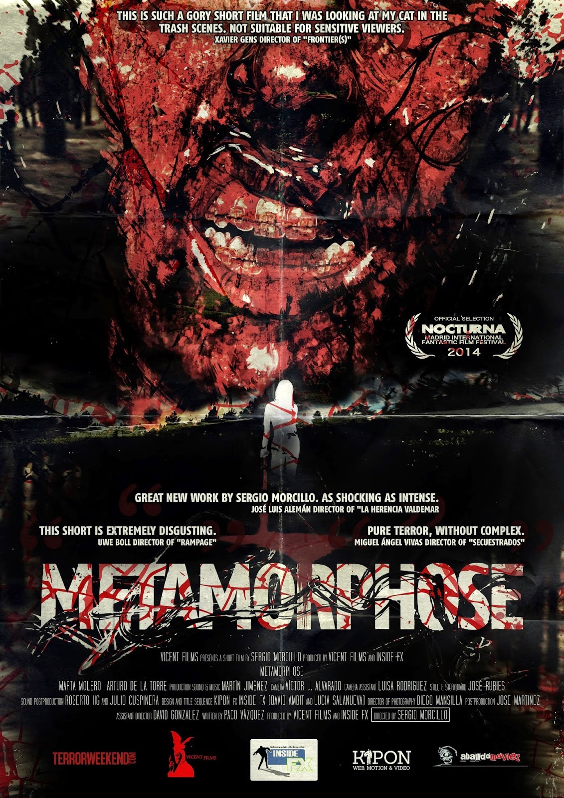 “Metamorphose”, de Sergio Morcillo.Con Marta Molero y Arturo de la Torre.Una chica huye aterrada y ensangrentada por un bosque...alguien la persigue.