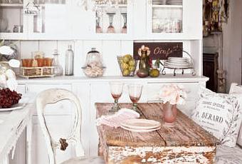 Shabby chic items are often heavily painted through the years, with many layers showing through obviously time-worn areas. The style is imitated in faux painting using glaze or by painting then rubbing and sanding away the top coat to show the wood or base coats. Fabrics tend to be cottons and linens, with linen being particularly popular, inspired by old French linens. Whites and worn or bleached out pastels are favorite colours. Fabric is often stained with tea to give it the look of old fabric. Bleached and faded are terms often applied to the style. It is not meant for old chipped furniture. The essence of today's shabby chic style is vintage and antique furniture with the original aged paint, or painted white (or another soft pastel color) and distressed at the corners by sanding. Antique pieces such as pie safes and jelly cupboards are popular in shabby chic décor. I show you any a photos...
