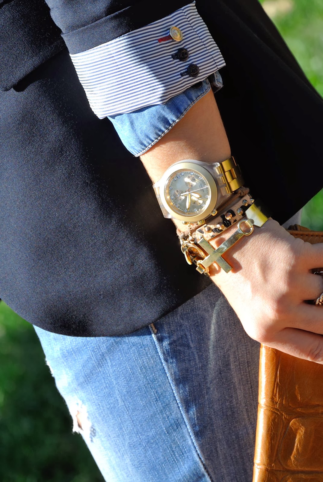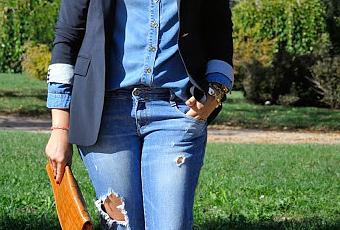 Me encantan los contrastes, en este caso los vaqueros tan informales y tan destrozados con la seriedad del blazer.Nada fuera de lo normal un look cómodo y con contrastes para un domingo de relax y en familia.