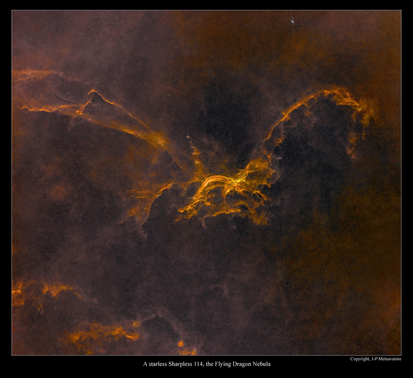 Es más fácil poder ver los detalles de una nebulosa sin estrellas, especialmente los detalles más tenues ya que destacan mejor. JP Metsavainio es un astrofotógrafo que procesa imágenes astronómicas de manera increíble, en ésta ocasión nos muestra mediante un gif animado el cambio de impresión de Sharpless 114, con y sin estrellas, cuyas imágenes estáticas podemos ver más abajo. Sh2-114 es una nebulosa de emisión HII compleja e inusual. Su compleja estructura, es probablemente el resultado de los vientos producidos por las estrellas calientes y masivas que interactúan con los campos magnéticos en el medio interestelar. Sin embargo, se sabe muy poco sobre ella. Usando estudios digitales del cielo existentes, Jacoby (2010) presentó Kn 26, una candidata PN bipolar conocida durante mucho tiempo como la fuente de la línea de emisión Lan 384. Aquí presentamos en alta resolución óptica y de infrarrojo cercano imágenes de banda estrecha de esta nebulosa. Los nuevos datos confirman la naturaleza PN de Kn 26 y revelan las características típicas de las nebulosas bipolares: la morfología de la mariposa, la emisión de H2, y el enriquecimiento de nitrógeno.