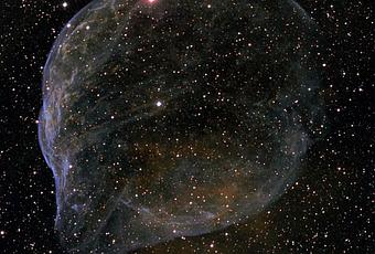 Las estrellas Wolf-Rayet tienen unas 20 veces la masa del Sol y se cree que se encuentran en una breve fase de pre-supernova en la evolución de las estrellas masivas. Los rápidos vientos procedentes de esta estrella Wolf-Rayet crean la nebulosa con forma de burbuja a medida que barren el material móvil más lento de una fase de evolución anterior. La nebulosa hinchada por el viento estelar tiene una edad de unos 70.000 años. La emisión relativamente débil captada en esta imagen está dominada por el resplandor azulado asignado a los átomos de oxígeno ionizado.