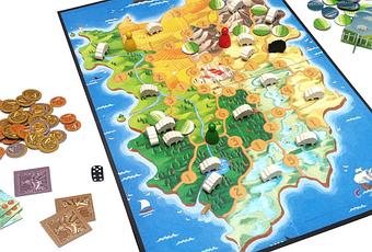 El tablero de juego muestra la isla deSheepland, dividida en 18 Regiones rodeando la Ciudad de Sheepsburg. Hay 6 tipos de cada Terreno, y 3 Regiones de cada Terreno. Las Regiones están separadas mediante caminos. Cada camino está marcado con un número. -