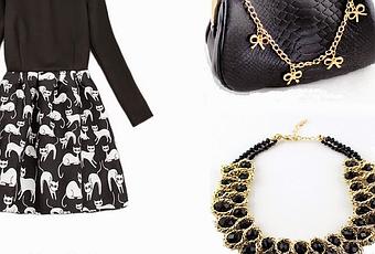 1- Vestido gatos AQUÍ, 2- Monedero lazos AQUÍ, 3- Collar dorado y negro AQUÍ