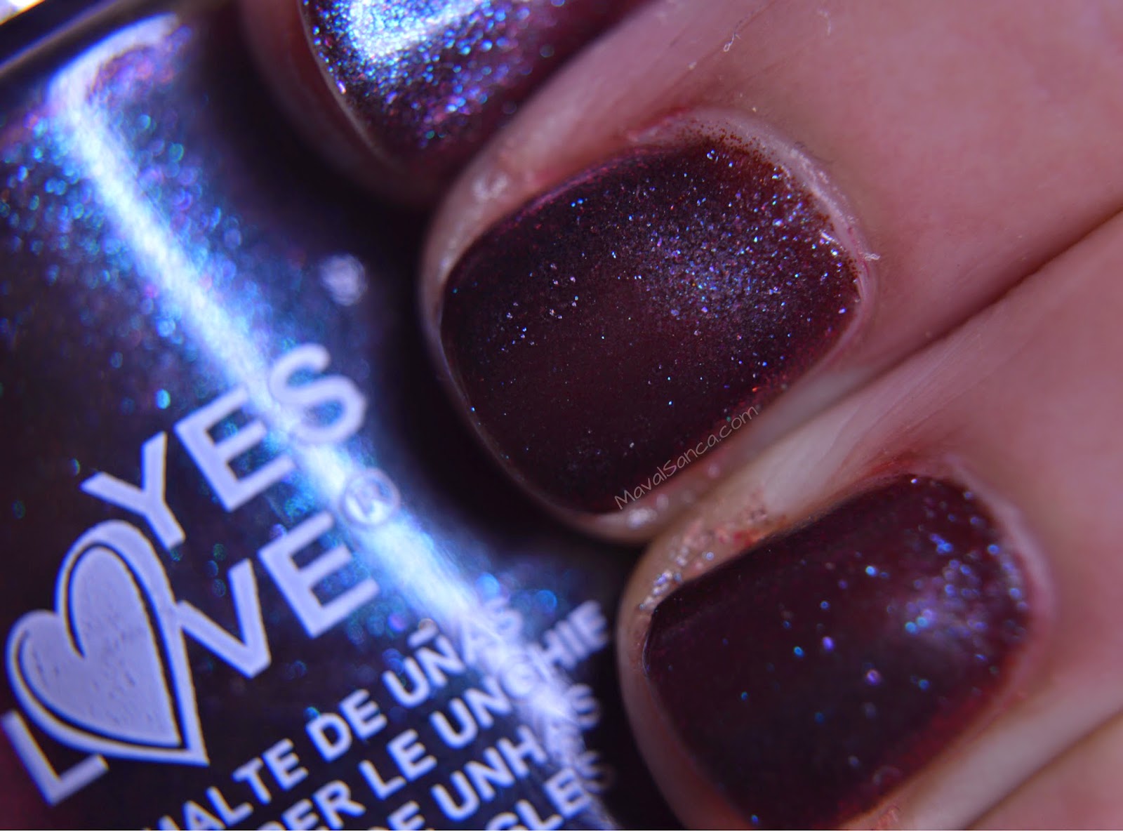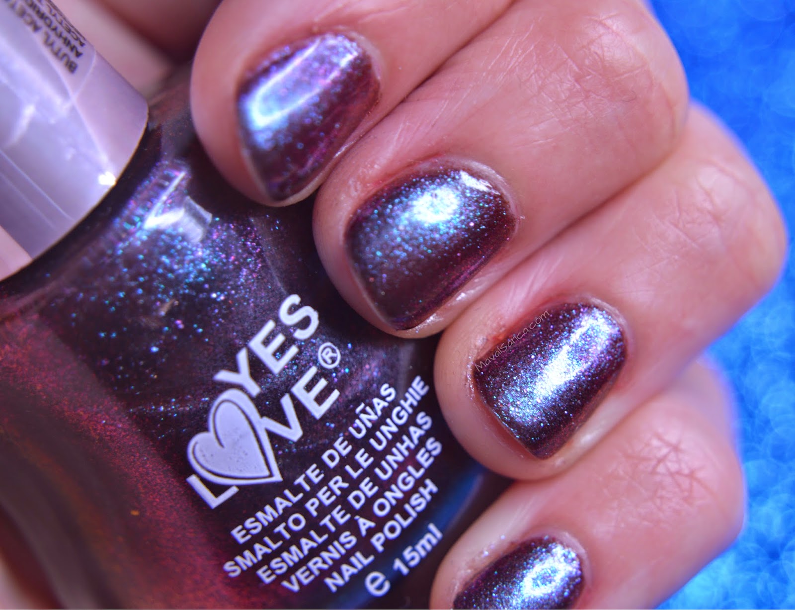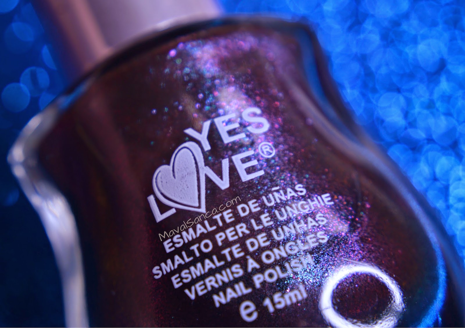 El esmalte Shiny Glitter M43 de Yes Love es un esmalte tornasolado.Van desde el más visible, un intenso color púrpura, hasta un granate.