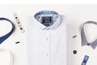 Tres modelos con tres cuellos desmontables: unos con el mismo tejido de la camisa; otro con una tela a contraste y un tercero siempre blanco y con las puntas redondeadas. Mezclar, combinar y sorprender a través de diferentes botones intercambiables. Añadir los parches más modernos de gafas, bigotes o anclas.