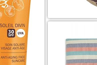 Protector solar facial con propiedades antiedad de Caudalie, chanclas con print animal de Havaianas y toalla pareo de Oysho.