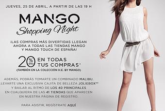 MANGO celebra de nuevo su Shopping Night este próximo jueves 25 de Abril a partir de las 19.00h. En el evento encontrarás prendas rebajadas al 20% incluyendo su línea masculina HE. Y también podrás saborear un combinado de Malibú, conseguir una cajita de belleza JolieBox (por compras superiores a 50€, la promoción no está disponible en Baleares y Canarias) y bailar al ritmo de los 40Principales.