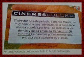 Advertencia colocada en los cines ACEC de Cornellá (donde se proyecta la película El Árbol de la Vida) inmortalizada en el ejemplar del 20 de septiembre de El Periódico de Cataluña.
