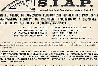 Pero además en la publicidad se menciona que tenía patentes argentinas para la fabricación de esos instrumentales para las terminales automotrices de nuestro país. Por eso me pareció oportuno publicar esta pieza gráfica. En parte porque debe ser una de las primeras de SIAP y segundo porque se conoce que significa la sigla.