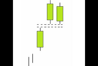 Este patrón se caracteriza por una candela verde con un gap alcista del precio que precede a una candela verde inicial y que es seguida por una candela verde final que es igual o muy similar a la segunda candela con respecto a la longitud del cuerpo real y el nivel de los máximos. En este patrón las candelas del segundo y tercer periodo tienen el mismo precio de apertura.