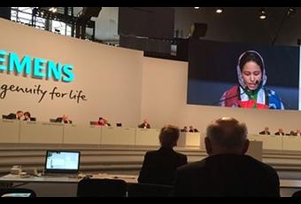¿Por qué no solicitó el permiso de mi gente?, una refugiada saharaui preguntó en la AGM de Siemens. La empresa no responde a las preguntas sobre por qué opera en tierras ocupadas.