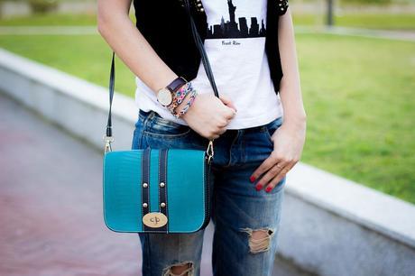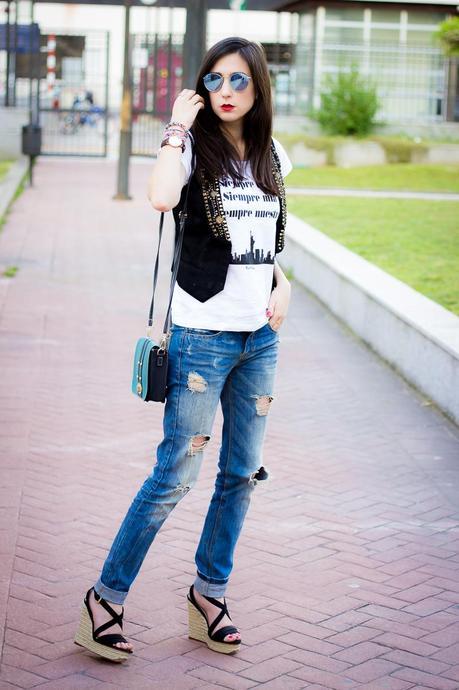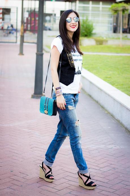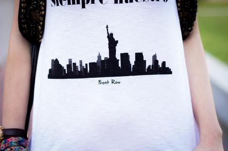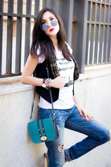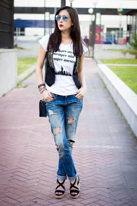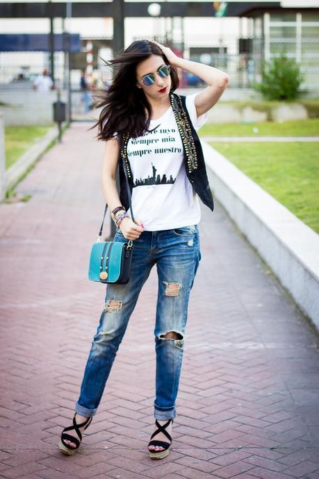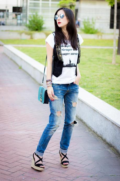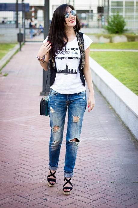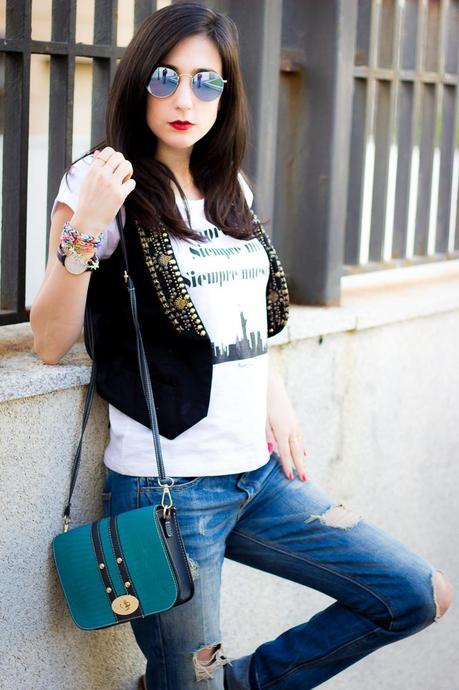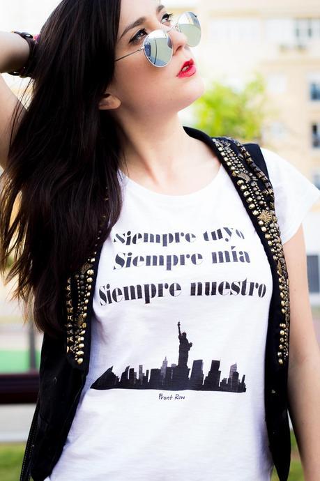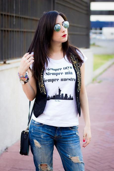 So when I saw this shirt , I directly moved to NY, Cosmopolitan in hand, friends and love , and I did not hesitate one second to me with her, because in the end life is always shared and that's the magic of this sentence ... its plurality .The shirt is from a new firm, I discovered recently, have just started , but I predict you great success, called Front Row, and I doubt that this is my only purchase, I highly recommend that you spend for your facebook and you cast ye out their film creations .As you know, what I like is the simple, basic but with details that make the difference, details that make it much more special and you save them with a different mime, always know that never go out of fashion , and clothes are always there. It is the magic of the timeless.To combine it, I decided to wear ripped jeans and vest from Zara , wedges and mint bag from Tiendas Princes for a touch of color.Hope you like it , see you tomorrow with a new post .A thousand kisses and love."Siempre tuyo, Siempre Mía, Siempre Nuestro..." emblemática ya es esa frase que se decían Carrie y Mr Big en Sexo en Nueva York, ¡Quién no ha echado alguna que otra lágrima viendo con las amigas las aventuras de esta mujer que se ha convertido en uno de los mayores iconos de estilo del mundo!A mí me encantaba esa serie, creo que es la única que he comprado y de las pocas que, pase el tiempo que pase, no me canso de ver una y otra vez, me encanta su cotidianidad a la hora de expresar sentimientos, ideas, formas de vida... me recuerda a mis amigas, a las de verdad, esas con las que te reúnes y pase el tiempo que pase y estén donde estén parece que no ha pasado ni un solo minuto desde la última vez que las vimos. Yo soy afortunada, Y tengo amigas que pasen 10 años o un minuto siempre están ahí. Esa es la magia de la vida, y la magia de esta serie, da igual si te has divorciado, casado o tenido hijos, cuando te sientas en esa mesa, para ellas nunca ha pasado el tiempo...Por eso en cuanto vi esta camiseta, directamente me trasladé a NY, Cosmopolitan en mano, amigas y mucho amor, y no dudé ni un solo segundo en hacerme con ella, porque al final la vida siempre es compartida y eso es lo mágico de esta frase... su pluralidad.La camiseta es de una nueva firma, que descubrí hace poco, acaban de comenzar, pero les auguro un gran éxito, se llama Front Row, y dudo mucho que esta sea mi única adquisición, os recomiendo mucho que paséis por su facebook y echéis un vistazo a sus creaciones de cine.Como sabéis, lo que más me gusta es la ropa sencilla, básica pero con detalles que marcan la diferencia, detalles que hacen que sea mucho más especiales y que las guardes con un mimo diferente, siempre sabes que jamás pasarán de moda, y siempre estarán ahí. Es la magia de lo intemporal.Para combinarla, decidí llevar jeans rasgados y un chaleco de Zara de pedrería, cuñas y mi bolso menta de Tiendas Princess para dar un toque de color.Espero que os guste, mañana nos vemos con un nuevo post.Mil besos y mucho amor."Acabé pensando en las relaciones. Las hay que te llevan a algo nuevo y exótico, las hay que son viejas y familiares, las que sacan a la luz muchas preguntas, las que te llevan a lugares insospechados, las que te transportan lejos de donde comenzaron y las que te traen de vuelta. Pero la relación más excitante, retadora e importante de todas es la que tienes contigo misma. Y si encuentras a alguien que ame el tú que tú quieres, bueno, eso ya es fabuloso" (Carrie Bradshaw)