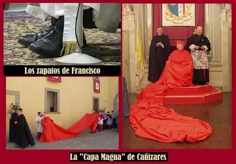 Resulta que el encabronado cardenal, que no ha encajado bien su sustitución, se niega a dejar su residencia en el Arzobispado de Madrid, residencia reservada para el arzobispo de turno, en este caso para el cardenal Carlos Osoro. No contento con tal acto de clara rebeldía y soberbia, seguirá conservando coche con chófer y me imagino que otras prebendas que nada van en consonancia con las directrices dadas o asumidas por su jefe Francisco, al que -es de suponer- no le guardará o tendrá cristiano afecto y al que debiera -por lo de los votos- obediencia.Otro que lleva mal lo de la ejemplaridad y humildad es el cardenal Antonio Cañizares. Mientras el Papa Francisco se niega a ponerse sobre el pecho la cruz de oro característica de los Papas y lleva colgada del cuello la misma cruz de metal que lucía antes de convertirse en pontífice, ni usa el ostentoso Anillo del Pescador, ni se ha puesto en ningún momento sobre los hombros la muceta de terciopelo rojo rematada con armiño blanco (una cucada, oiga) que los sastres Gammarelli habían preparado para él, o usa sus gastados zapatos negros de siempre en lugar de los lujosos zapatos de fina piel roja y realizados a medida; el Antonio Cañizares se nos enfunda una indefinible e indescriptible "Capa Magna" (usada en la ordenación de sacerdotes y ya desaconsejada por Pablo VI en 1969) que es como para darle cuatro hostias al encapado purpurado y encarcelar -tirando luego la llave al mar- a su diseñador.