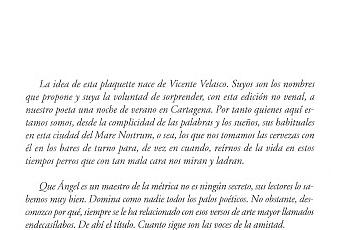 Y cuando -como todo el mundo sabe también (aunque pueda parecer que está de más decirlo)- cualquier publicación, por pequeña que sea, cuesta dinero, que lógicamente (como las mismas cervezas la mayoría de las veces) han pagado ellos... No tengo la menor idea -ni me lo van a decir- de si algunos o todos o qué parte cada quién, pero sí sé que eso lo hace para mí -si cabe- mucho más valioso aún. Es obvio que sólo puedo corresponder con el enorme agradecimiento que a buen seguro serán incapaces de traducir adecuadamente estas palabras, que acompaño -además de con la portada y la contraportada con sus nombres- con la imágenes de esas palabras previas a las que ya he aludido y del primero de los poemas del cuadernillo -en sucesivas entradas me encantará ir añadiendo el resto hasta completar los siete, dado que se trata de una edición no venal de sólo 50 ejemplares.