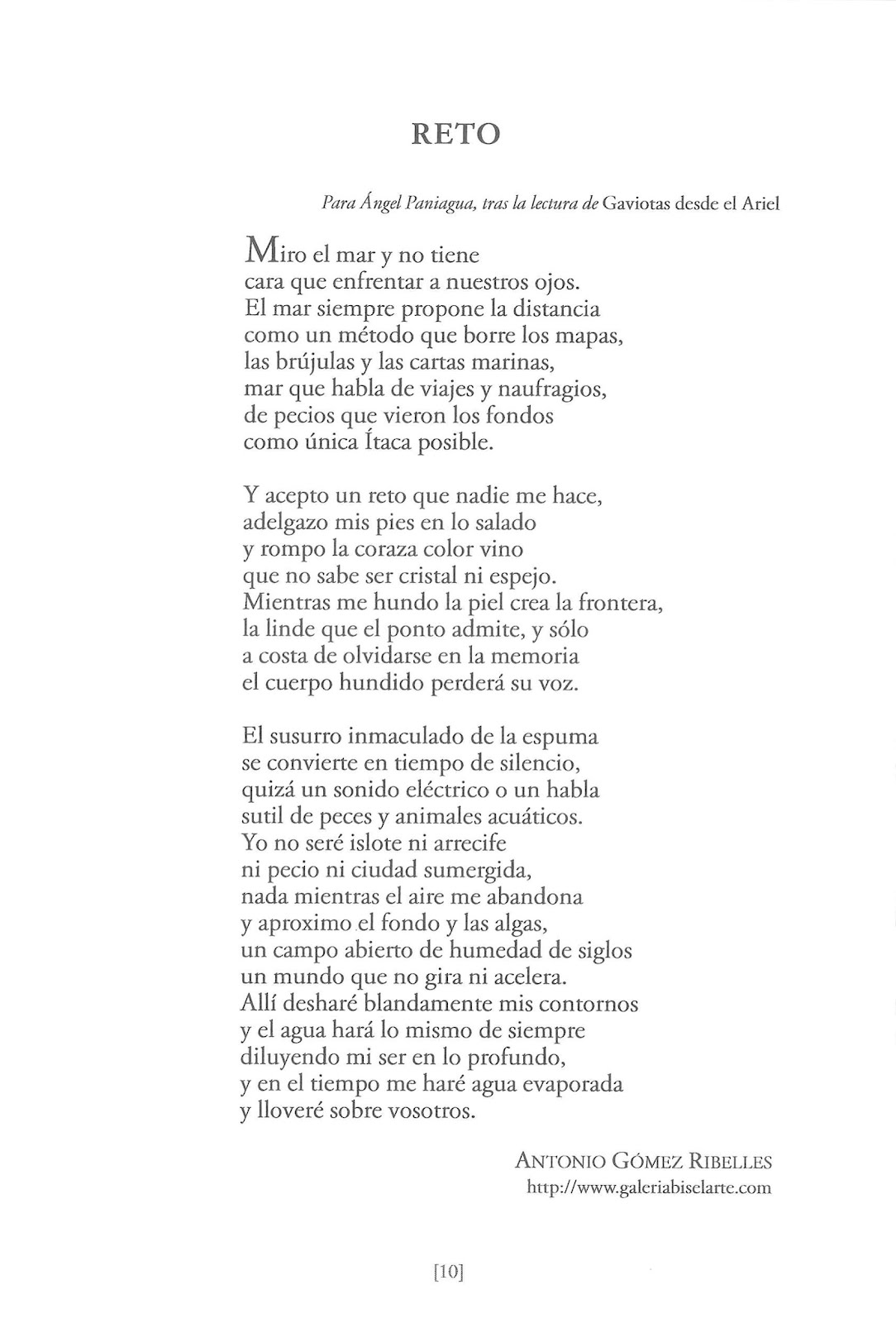 Siguiendo con los poemas de la plaquette-homenaje a la que he dedicado las últimas entradas, traigo ahora dos poemas más. Uno de ellos, el peculiar y sentido Reto de Antonio Gómez Ribelles, escrito —él mismo lo indica— "tras la lectura de Gaviotas desde el Ariel":