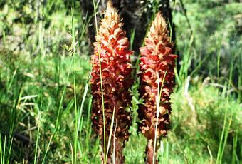 El orobanche es un gorrón. El orobanche es una planta parásita que se agarra a las raíces trabajadoras de la retama o de otras plantas que crezcan cerca de ella; mide hasta treinta centímetros de altura, nunca tiene tonos verdes porque carece de clorofila, ya se cuida de tomar el alimento preparado y además coloca sus pequeñas semillas en forma de huevo en el suelo donde espera con paciencia a pasar a vivir a costa de un nuevo huésped. Pero es una planta de brillos luminosos. Es un gorrón el orobanche.