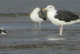 Buscando entre los grupos de gaviotas, como ya comenté el otro día, por estas fechas se puede detectar algún adulto de gaviota argéntea Larus argentatus, escondida entre las patiamarillas y sombrías. Pongo una que encontré en la visita del jueves a la playa de Bañugues.