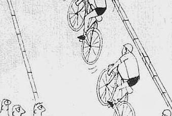 Ya vimos uno de los usos que los redactores de la revista le daban a esa rueda de bicicleta hasta transformarla en una ruleta. Hoy el caso es diferente y un automóvil testeado se trae a la “rastra”a un pelotón de ciclistas. Por eso imagino una situación similar en la famosa carrera de bicicletas francesaque se desarrolla cada mes de julio por todo el país. Los ciclistas detrás de lo que creen que es la bicicleta líder en plena carrera.