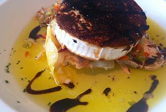 Un viernes de estos que pareceia que se habia caido el sol en Barakaldo, de manera literal, quedé con una amiga para comer en Sikera. Para arrancar, las dos nos tiramos a por la ensalada del mar con queso, compuesta de lascas de bacalao desalado, bacalao ahumado, salmón del mismo modo, y todo mezclado con lechuga y vinagreta de pimientos. Emocionaba estaba yo con lo del queso de cabra gratinada, cuando apareció aquel circulo negruzco...pues vaya. No me dio tiempo ni a quejarme, del hambre que tenia.