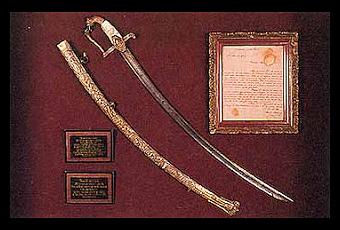 Y a uno de esos símbolos iba destinado este post (y terminé largando esta perorata): La Espada de Bolívar. No creo que haya muchos símbolos referidos a nuestra independencia con un peso o valor mayor que ese adornado trozo de acero que en algún momento fue empuñado y blandido por el buen Simón en medio de sus esfuerzos. Espadas habrá tenido muchas sin duda, buenas y malas, de batalla y de gala, con y sin denominación de origen, para usar, para romper, para extraviar, para entregar en la derrota y para alzar en la victoria, muchas... pero La Espada de Bolivar dejo de ser "objeto" particular o específico para convertirse en "idea" creo yo que aún antes de su propia muerte.