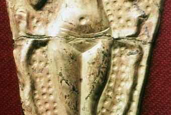La estatua más conocida es una figura femenina ataviada con un vestido largo, de estrecha cintura y con un corpiño que deja el pecho al descubierto. En ambas manos sostiene sendas serpientes y tiene encima de la cabeza un felino, probablemente una pantera.