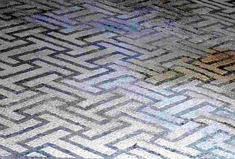 En varios puntos se han juntado trozos de teselas poligonales haciendo al conjunto muy de geometría elemental con cuadrados, hexágonos, rombos, trapecios,…