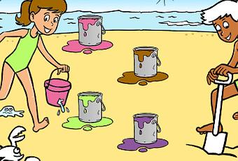 En la playa dos niños juegan y hay cuatro botes de pintura. Escucha la secuencia de sonidos de los botes de pintura y reprodúcela igual.