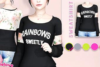 Es un top inspirado en la que fue mi sudadera favorita de la vida real en aquella época (Tengo la de color fucsia), que tiene un estilo holgado (¡perfecto para la moda asiática y streetwear!) y un diseño realmente encantador. En el pecho lleva un estampado que dice Rainbows Sweetly 🌈, mientras que en la espalda y los brazos tiene partes de tela semitransparente con un estampado floral, agregando ese toque delicado pero moderno. 🌸