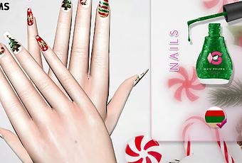 Estas uñas no solo son elegantes y brillantes, sino que también están llenas de detalles que capturan el espíritu de la Navidad. Cada uña tiene un diseño único que incluye arbolitos de Navidad, bastones de caramelo y lazos festivos. Además, he utilizado los colores típicos de la Navidad como el dorado, blanco, rojo y verde, todos ellos en pinturas llenas de purpurina que harán que tus Sims brillen en cualquier fiesta. 🎁💅