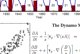 Las observaciones telescópicas pioneras de Galileo Galilei y de Christopher Scheiner en el siglo XVII iniciaron la observación y contaje de las manchas solares. Unos 400 años de de observación han mostrado que sólo en el período 1645-1715 dC, conocido como el mínimo de Maunder, cuando casi no se observaron manchas solares, la serie temporal de las manchas solares muestra una variación cíclica pasando por épocas sucesivas de máxima y mínima actividad. El nuevo artículo ha desarrollado un nuevo modelo de la dinámica solar que resuelve las ecuaciones de evolución para las componentes toroidal y poloidal del campo magnético solar (escritas en la figura) con las que han estudiado más de 210 ciclos solares correspondientes a 1.860 años. Estas simulaciones estudian el efecto del cambio de los flujos meridionales mediante la introducción de fluctuaciones en el flujo meridional.