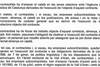 Licitaciones públicas. Abiertas a cualquiera. En teoría. Hay maneras de limitar la competencia. Sucede en toda España. Y las maneras son muchas. Vamos con Cataluña. Ahí va un pliego al azar. 116.000 euros licitados. No es poca cosa. De la Agencia de Residuos de Cataluña. Va unos a leer los Pliegos, que están en catalán, una de las dos lenguas oficiales del territorio. Busca un rato y no los encuentra en castellano, la otra lengua oficial en el territorio. Se lee el pliego administrativo en catalán y allí aparece, como quien no quiere la cosa. En el apartado 20 (obligaciones del contratista):
