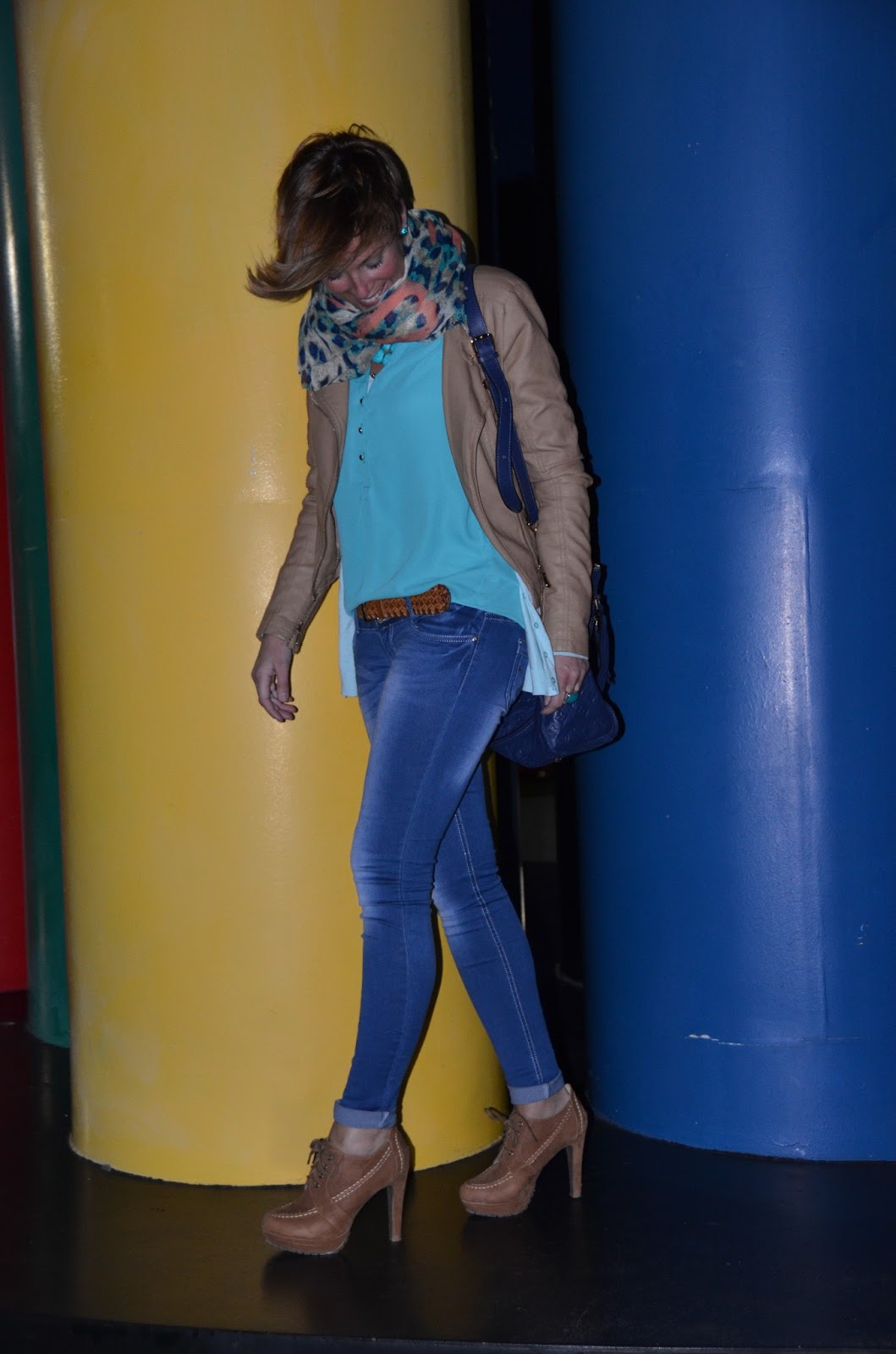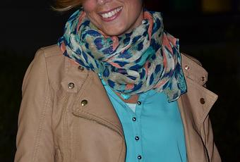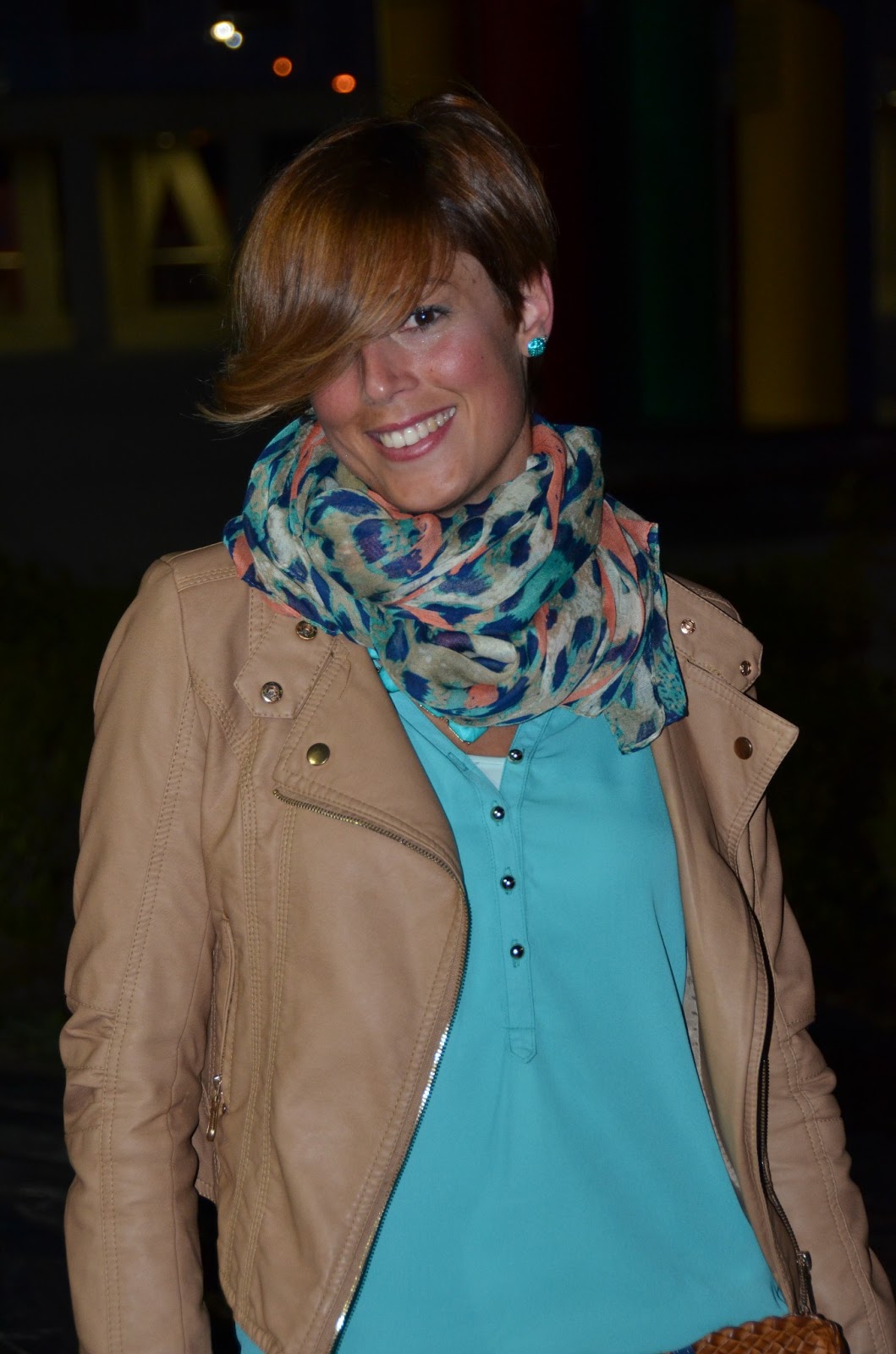Para el cuello, escogí un fular de nueva colección en tonos azules, verdes y corales, mis preferidos esta campaña.