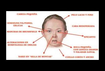 ojos sesgados hacia arriba; a veces los niños son bizcos o tienen problemas de la vista